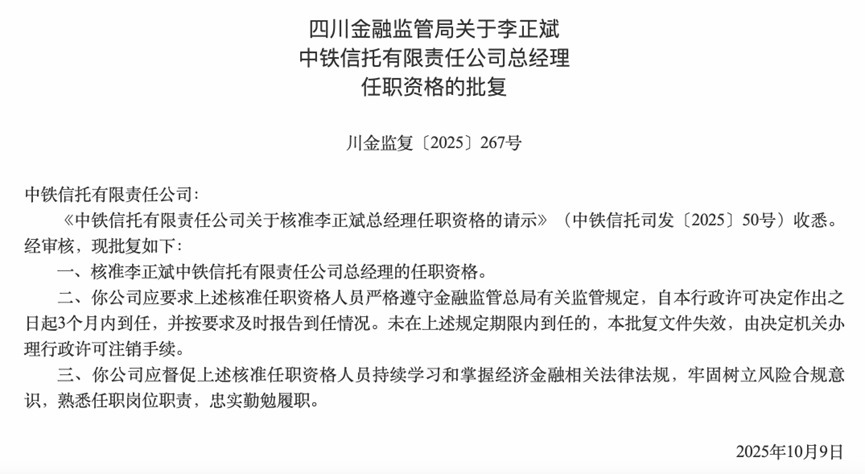 10月13日,四川金融监管局发布《关于李正斌中铁信托有限责任公司总经理任职资格的批复》(川金监复〔2025〕267号),核准李正斌中铁信托总经理的任职资格。